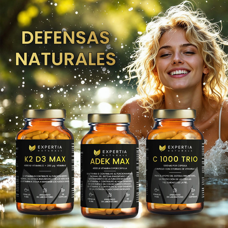 Pack Defensas Naturales combina K2 D3 Max, ADEK MAX y C 1000 Trio para reforzar defensas, proteger corazón y cerebro de forma natural y mantener un sistema inmunitario saludable.