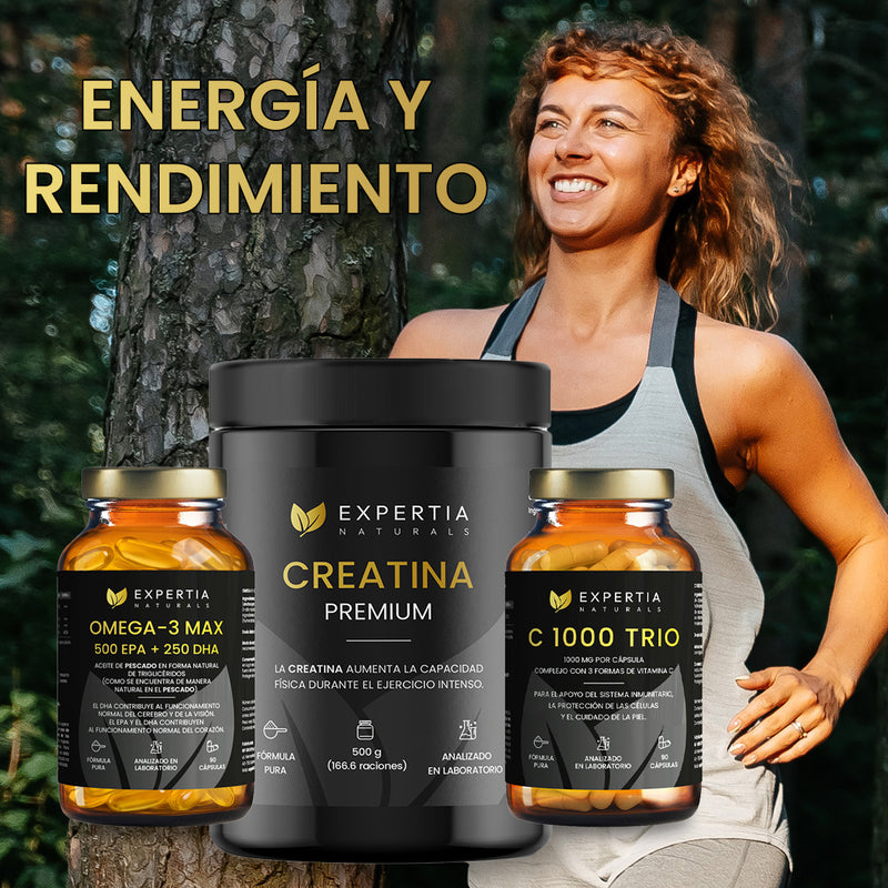 Pack Energía y Rendimiento combina Creatina Premium, Omega-3 Max y C 1000 Trio para incrementar fuerza, resistencia y rendimiento físico, además de apoyar el sistema inmunológico y la recuperación muscular.